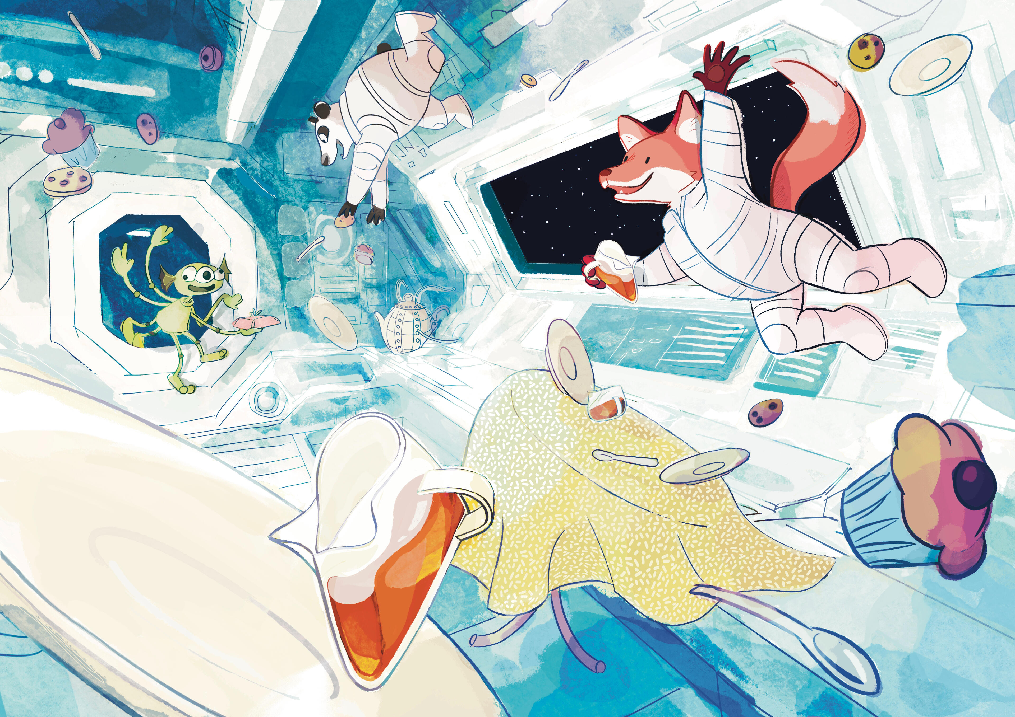 Illustrazione a doppia pagina per una libro illustrato e scritto e da me (+4) intitolato Zero GraviTea: ulteriori informazioni su richiesta